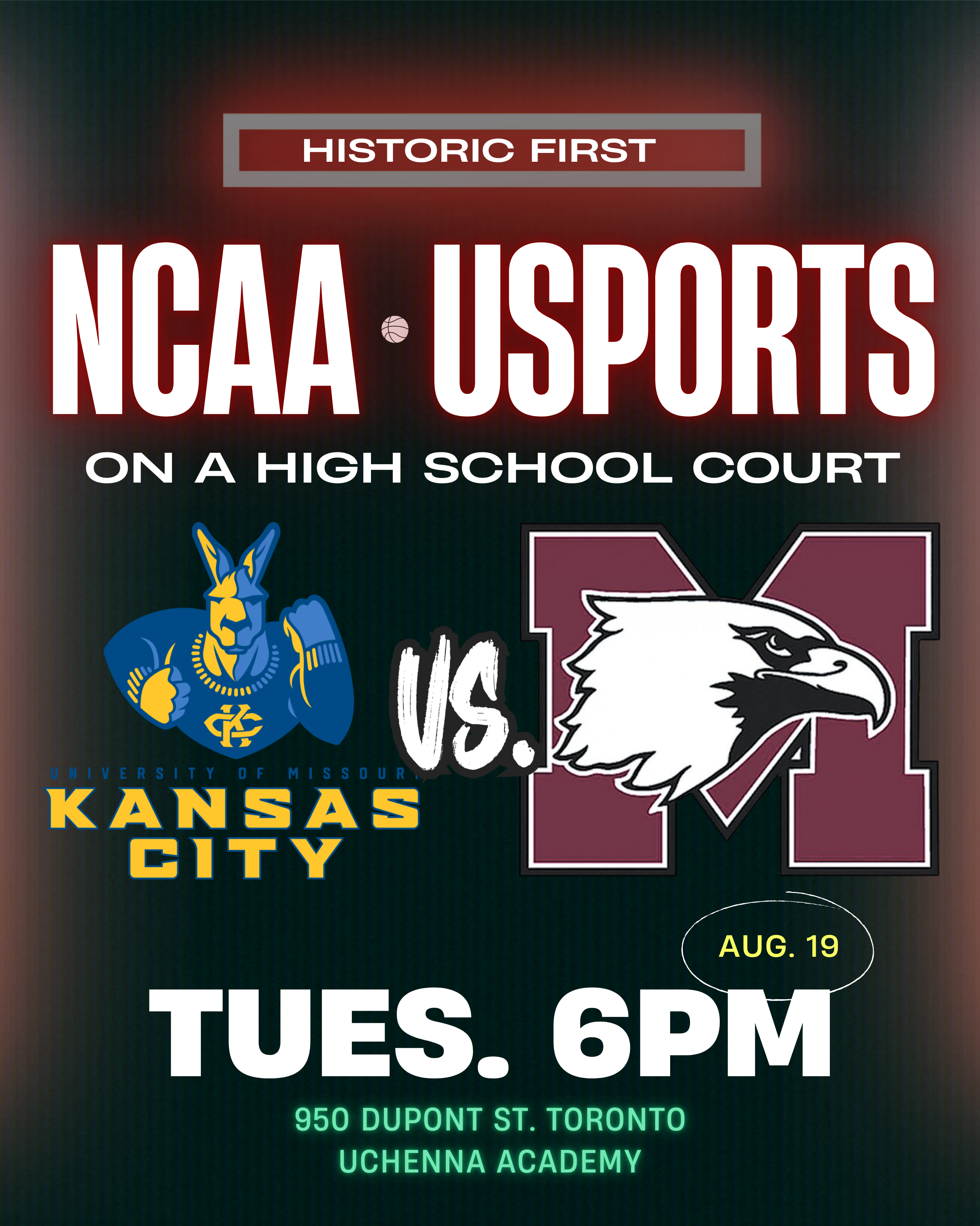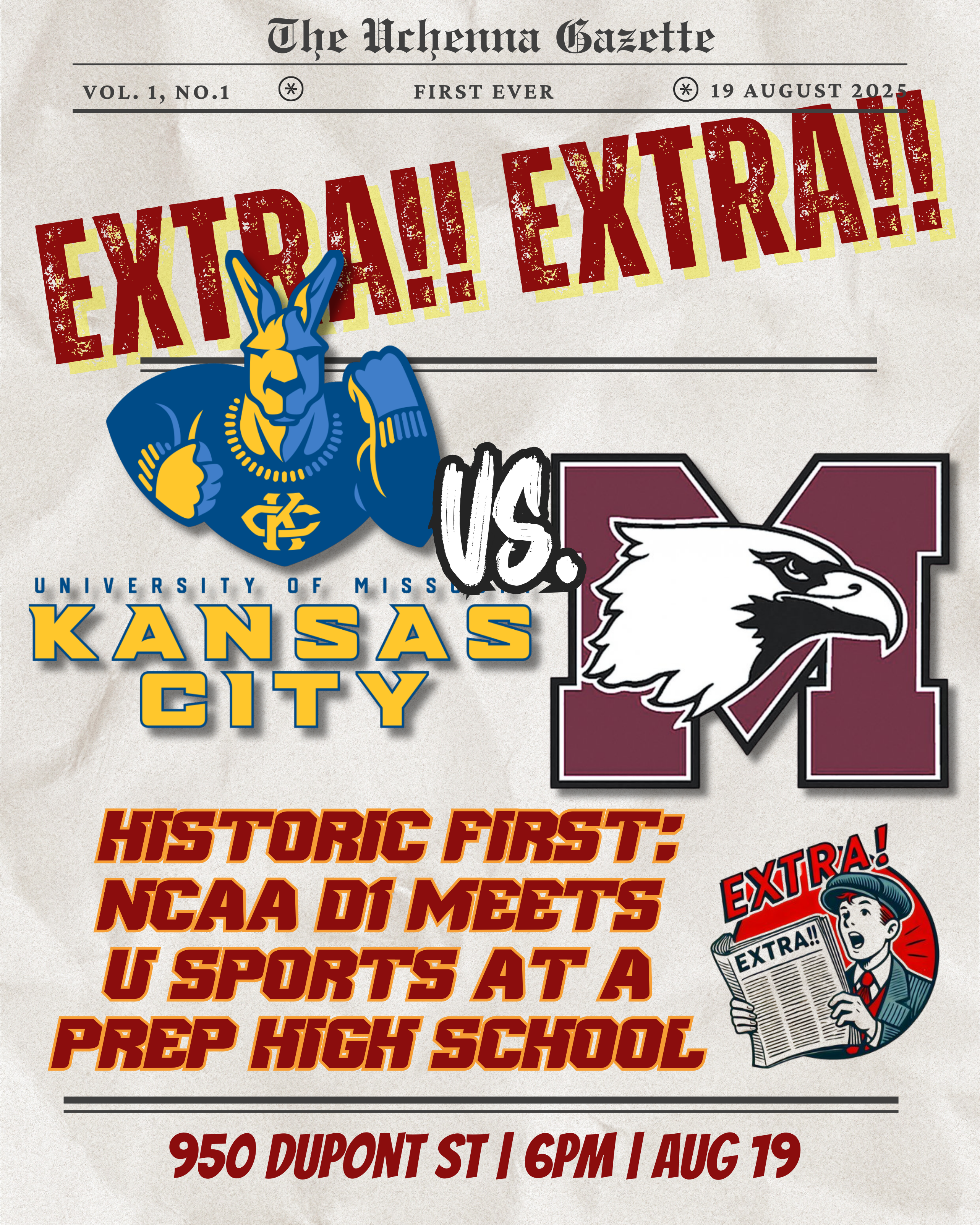 Be part of history! Tuesday, Aug. 19 , 2025 – UMKC vs McMaster, the first-ever DI vs U-Sports game at our high school.